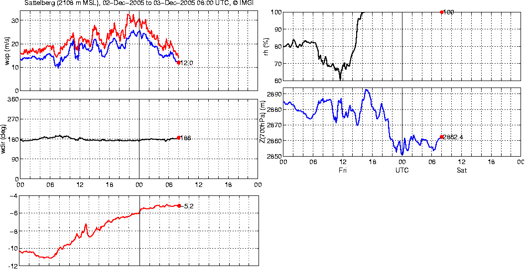 Die Frage hinsichtlich der Herkunft der Föhnluft in Innsbruck lässt sich bereits hier beantworten – der erste Föhndurchbruch in Innsbruck um 15 UTC korreliert mit einem Maximum am Sattelberg sowie mit einem deutlichen Geopotentialfall der 700hPa-Fläche. Der Vergleich der Temperaturen ergibt eine überadiabatische Durchmischung mit Innsbruck um 15 UTC. Die Föhnluft stammte also aus noch höheren Niveaus als vom Sattelberg, etwa 2200m, aber nicht vom Patscherkofel, wie später noch zu sehen ist. Sattelberg und Ellbögen waren ab dem ersten Föhnmaximum um 11 UTC am Sattelberg (leicht verzögert in Ellbögen weiter nördlich) annähernd durchmischt, ab 2 UTC waren beide Stationen nicht mehr durchmischt, in Ellbögen fiel ab dato auch die Temperatur langsam ab. Hier wäre bis zum Frontendurchgang eine seichte Föhnströmung durch den tiefen Einschnitt am Brenner denkbar. Immerhin deutet der gleichmäßige Temperaturfall auf eine weiterhin stabile Schichtung hin (im Gegensatz etwa zu dem abrupten Temperatursturz in Innsbruck).