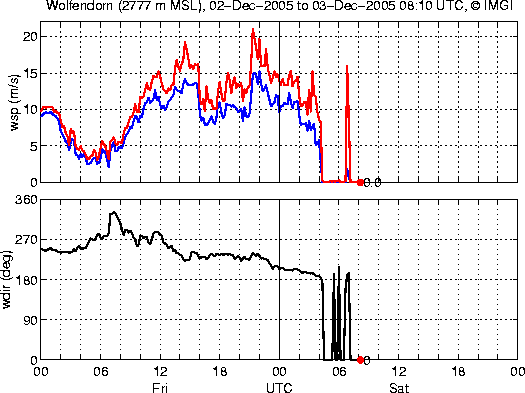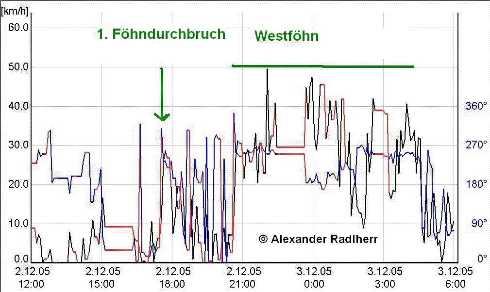 Die Winddaten (blau die Windrichtung, schwarz die Windgeschwindigkeit, rot Datenausfälle) zeigen zunächst variable Nordwinde mit schwachen Windstärken, gegen 16.15 UTC den ersten Föhndurchbruch, etwa eine Stunde später als in Innsbruck, mit Westwind und von 20 bis 4 UTC eine andauernde Südföhnperiode mit Westwind. Die zwischen dem ersten Föhndurchbruch und der Föhnperiode aufgetretenden Nordwinde bei gleichzeitiger Abkühlung der Lufttemperatur (nicht in der Skizze) könnten möglicherweise auf den Talauswind vom nördlich ins Inntal mündenden Halltal zurückzuführen sein, das eine klare Nord-Süd-Achse aufweist.