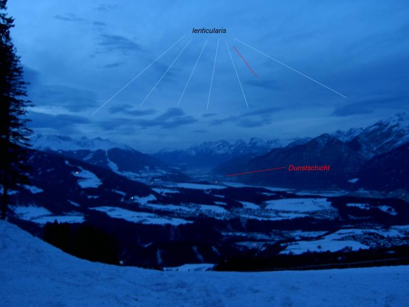 Wie bereits in dem Foto oben abgebildet, wehte im Oberland bis etwa zu einer Grenze Martinswand — Sellraintalausgang weiterhin ein kalter Westwind , der durch die starke Kaltluftproduktion eine seichte Dunstschicht erzeugte.