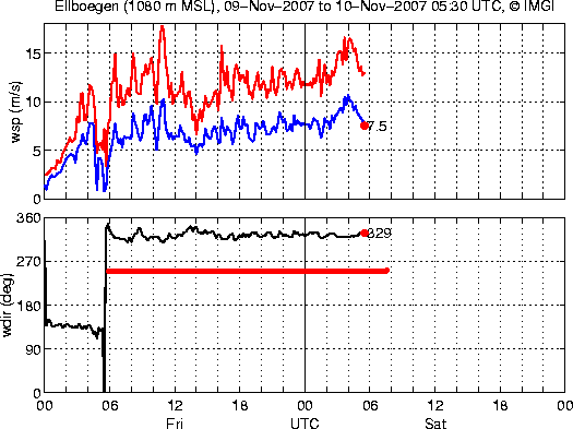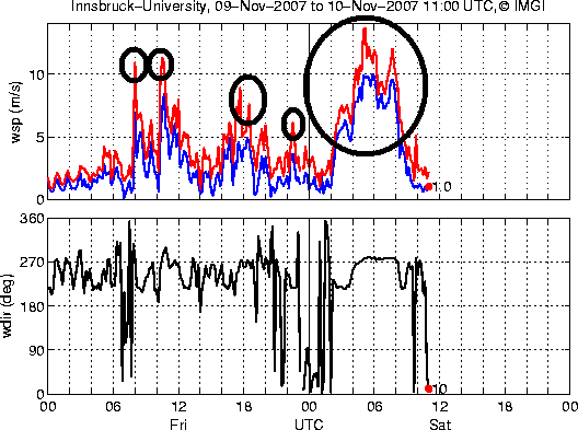 Folgendes Diagramm zeigt die Windrichtung (in °) und Geschwindigkeit (Mittel + Böen in m/s) von Ellbögen (1080m) im unteren Wipptal. Bis 6 UTC des Vortags herrschte noch Ausfließen (mit einer starken Zunahme kurz vor dem Windsprung, die ich mir nicht erklären kann), ab 6 UTC brach in Ellbögen der Nordföhn durch und wehte bis 10. November einschl. 10.30 UTC (letzte Aktualisierung) ohne Unterbrechung, erkennbar an der starken böigen Nordwestkomponente).