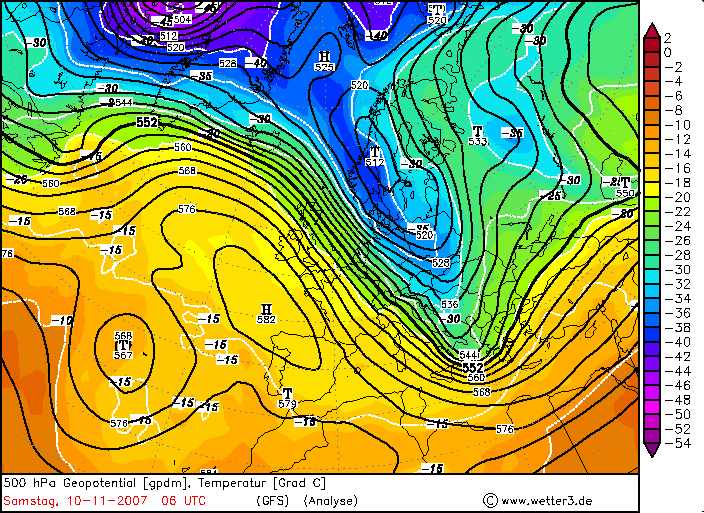 Ein intensiver langwelliger Trog stößt nach Südosteuropa vor, die Haupttrogachse, welche Österreich am 09. November, 12 UTC überquerte, ist zu diesem Zeitpunkt schon bis zum Balkan südostwärts geschwenkt. Nachfolgend ist ein nur schwach gekrümmter Kurzwellentrog über der Nordsee in die intensive, nordwestliche Höhenströmung eingelagert, der mit einer offenen Welle in der unteren Troposphäre verbunden ist. Westösterreich befindet sich im linken Auszug des Jetstreams unter Labilisierung und Hebung.