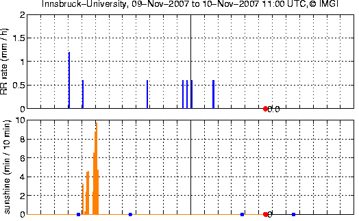 Folgende Diagramme zeigen die Station Uni Innsbruck mit Temperatur, Feuchte, Druck, Windrichtung- und geschwindigkeit sowie der stl. Niederschlagsrate und minütl. Sonnenscheindauer.