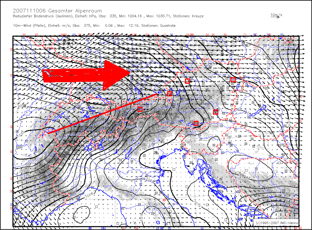 In der Vera-Analyse vom 10. November, 6 UTC (dargestellt Isobaren und Wind) befindet sich der höhere Luftdruck klar im Westen, rein synoptisch bzw. vom Druckgradient her ist also eher eine westliche bis südwestliche Anströmung vorherrschend. Dies spricht schon einmal gegen ein massives Einfließen von Kaltluft über das Unterinntal her, ist aber nicht gleichbedeutend mit Südwestwind in Innsbruck, da das Alpental isoliert von den synoptischen Winden ist.