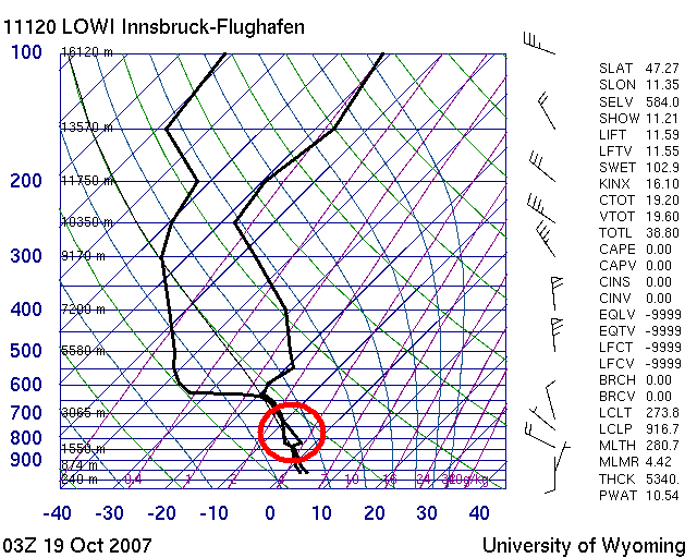 Ein Vergleich mit der Zugspitze um 6 UTC zeigt, dass abermals keine Durchmischung mit 700hPa erreicht worden ist (+3 in Innsbruck, -17 an der Zugspitze), also wieder über eine Gebirgslücke die wärmere Luftmasse ins Inntal hinabgekommen sein muss („gap flow“).