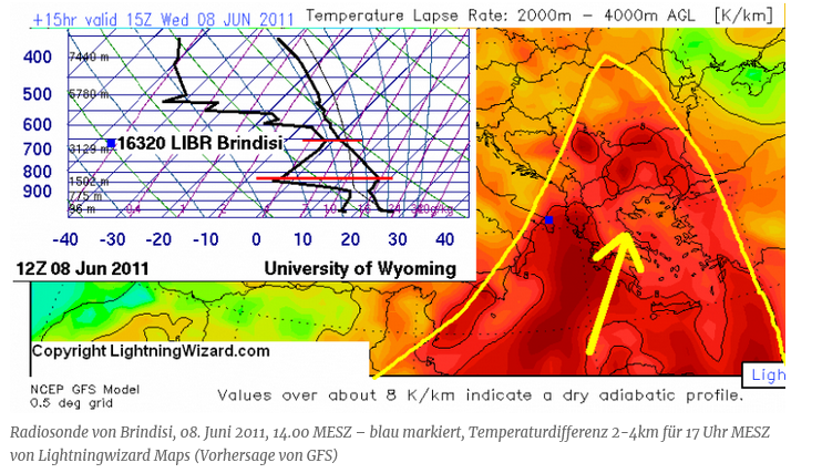 Heiße und trockene Luft aus Nordafrika strömt mit Südwestwind zum Balkan, im Radiosondenaufstieg von Brindisi (Italien) sichtbar anhand der trockenadiabatischen Temperaturschichtung zwischen 800 und 700 hPa. In den Lightningwizardkarten dargestellt mit den 2-4 km lapse rates. Je rötlicher, umso trockener die Luftmasse. Nach dem letzten Update der Lightningwizard Maps wurden die 2-4 km lapse rates durch „Warm Layer to 500 hPa Temperature lapse rate“ ersetzt.