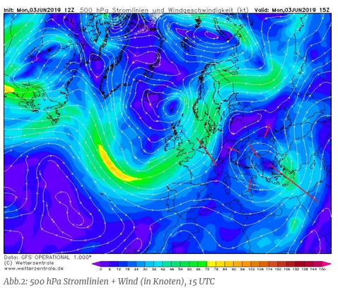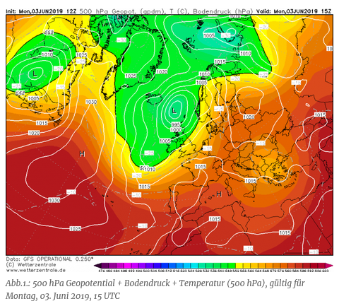 Die Wetterlage am Montag, 03. Juni 2019, 15 UTC, zeigt flache Druckverhältnisse im Alpenraum und eine schwache Keilbrücke zwischen einem Keil über den Balearen und einem weiteren über Polen bis Ukraine. Die Schwachstelle liegt genau im Alpenraum, einerseits durch einen flachen Trog über Ostfrankreich, Benelux, Westdeutschland, und durch Ausläufer des Höhentiefs über Bulgarien, die den Osten von Österreich beeinflussen.