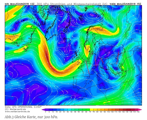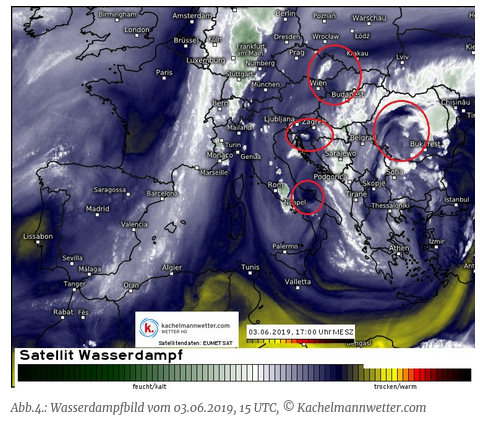 Das in der nachfolgenden 500 hPa-Karte zu sehende Höhentief mit Zentrum über Bulgarien existiert nun seit Mittwoch 27.5., als es sich über Italien abgeschnürt hat. Zwar hat es sich ein wenig nach Osten bewegt, ist zwischendurch aber dem Osten Österreichs immer wieder näher gekommen. In den aktuellen (Stand 06.06.) Berechnungen wird es an den Folgetagen endgültig in den Trog über Westeuropa integriert und füllt sich dabei auf. Erst dann geht die Großwetterlage mit Trog Süd- bzw. Südosteuropa zu Ende.