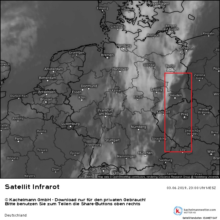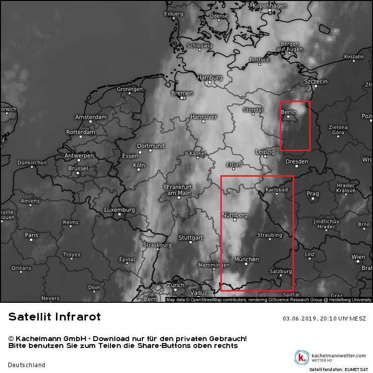 Im infraroten Kanal sieht man die Linie sogar noch besser und durchgehend vom Alpenrand bis Oberfranken, eine schwächere Linie ist in Brandenburg östlich von Berlin erkennbar.