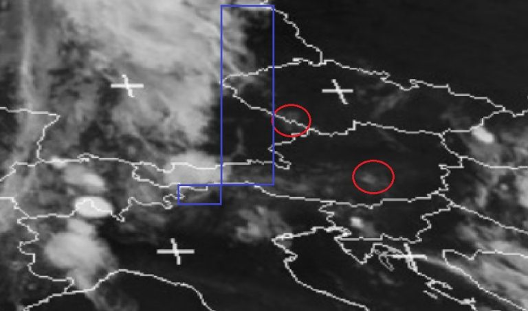 In Abbildung 12 sieht man links, rechts und hinter dem Schneeberg jeweils die Reste ehemaliger Gewittertürme (Ambosswolken in Auflösung). Sie betreffen den südlichen roten Kreis etwa in Höhe Wölzer und Seckauer Tauern in 175km Entfernung.