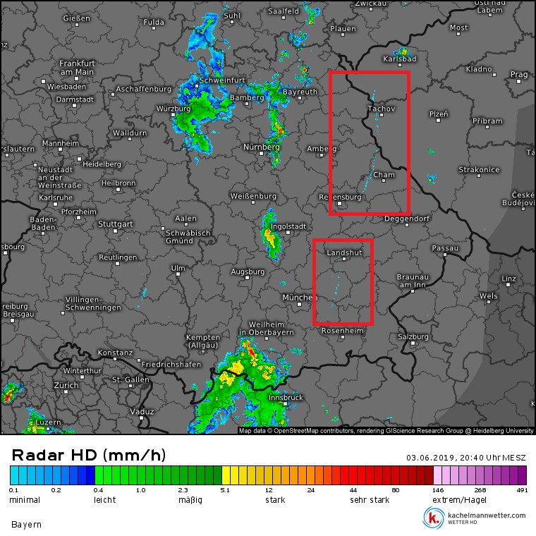 Im infraroten Bild vom 20.45 MESZ sieht man nicht nur die unterbrochene Linie über Bayern und Sachsen, sondern auch eine schmale Linie, die den Alpenhauptkamm überspringt. Sie sorgte kurz darauf über Südtirol für kräftige Gewitterbildungen.