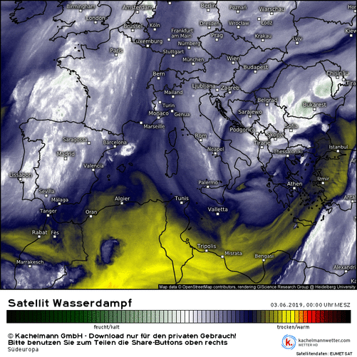 Im Wasserdampfbild sieht man eine lange dünne schwarze Linie mit sehr trockenen Luftmassen, ein sogenannter Dark Stripe. Deutlich ausgeprägter ist dieser über dem östlichen Mittelmeer bis Türkei und Schwarzes Meer. Hier spricht man von einem Dryslot. Dryslots treten üblicherweise in Zusammenhang mit kräftigen Bodentiefentwicklungen auf, während dark stripe eher bei nicht vollständig abgeschlossenen Zirkulationen zu finden sind. Häufiger findet man sie im Bereich eines Jetstreams, nicht selten gleichzeitig mit verstärkten Turbulenzen im oberen Luftraum.