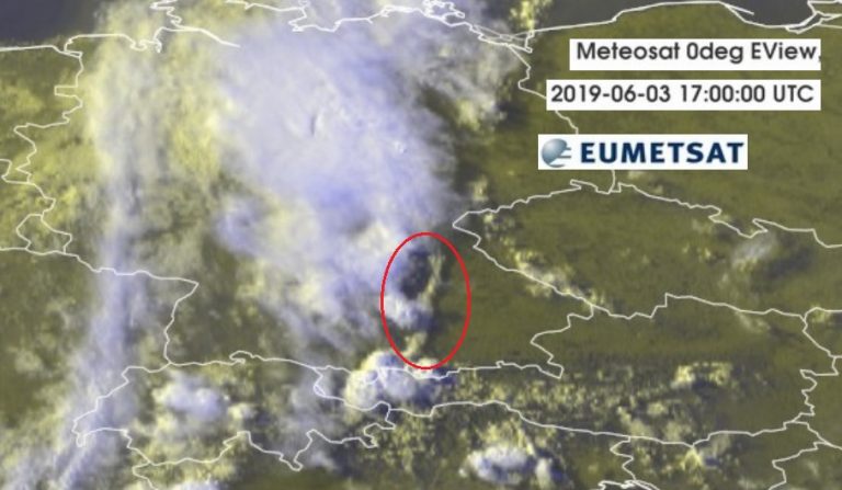 Der Loop zeigt eindrucksvoll, wie an der ursprünglich schmalen Linie zuerst Verwellungen auftreten, die sich dann jeweils zu eigenständigen Zirkulationen entwickeln. In Abbildung 4 ist jeweils an den Westflanken der Knubbel konvektive Bewölkung erkennbar. Die dunklen Streifen bzw. runden Knubbel waren also tatsächlich mit potentieller Vorticity „gefüllt“, sodass es in der Umgebung zur Gewitterbildung kommen konnte.