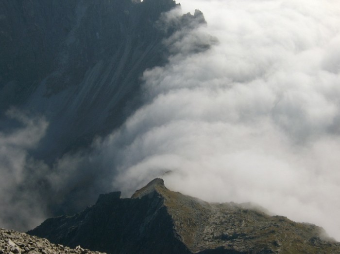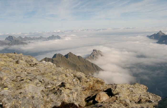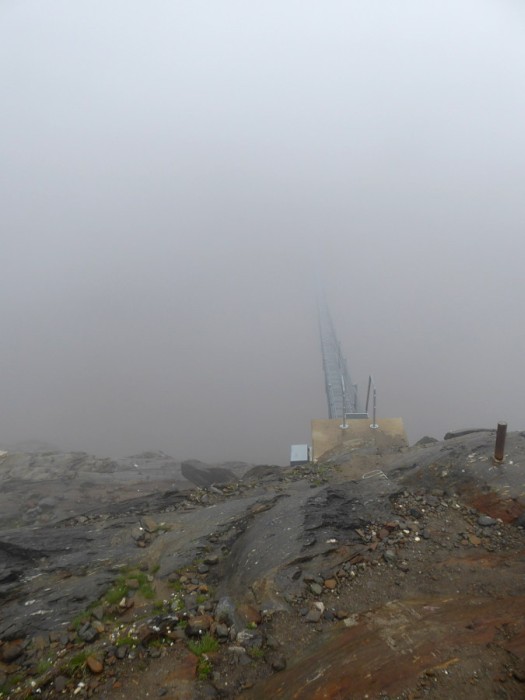 Zugegeben banal, aber da Nebel per definitionem eine Wolke ist, können starke Sichteinschränkungen natürlich auch dann auftreten, wenn man in tiefe Restbewölkung eintritt, so wie am zweiten Tag einer geführten alpinen Wanderung in den Ötztaler Alpen. Am Vormittag hielt sich noch hartnäckige Restbewölkung einer abziehenden Front über 2500m Seehöhe.