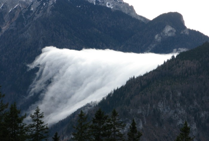 Hier strömte der Nebel von links nach rechts (Ost nach West). In der Höhe wehte eine straffe Südwestströmung, am Abend ging eine Kaltfront durch, die den Wind in tieferen Schichten auf Nordwest drehen ließ. Das erklärt die Strömungsrichtung des Nebels zwar nicht, aber hier habe ich keine andere Erklärung.