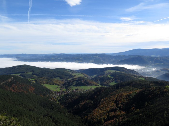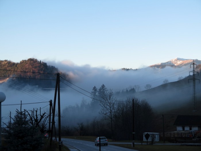 Hier handelt es sich nicht um seichten Bodennebel, sondern um Hochnebel. Wir waren im Zuge unserer Wanderung im Wienerwald lediglich durch die Nebelschicht durchgetaucht, sodass wir zum Schluss die Nebelgrenze durchstießen.