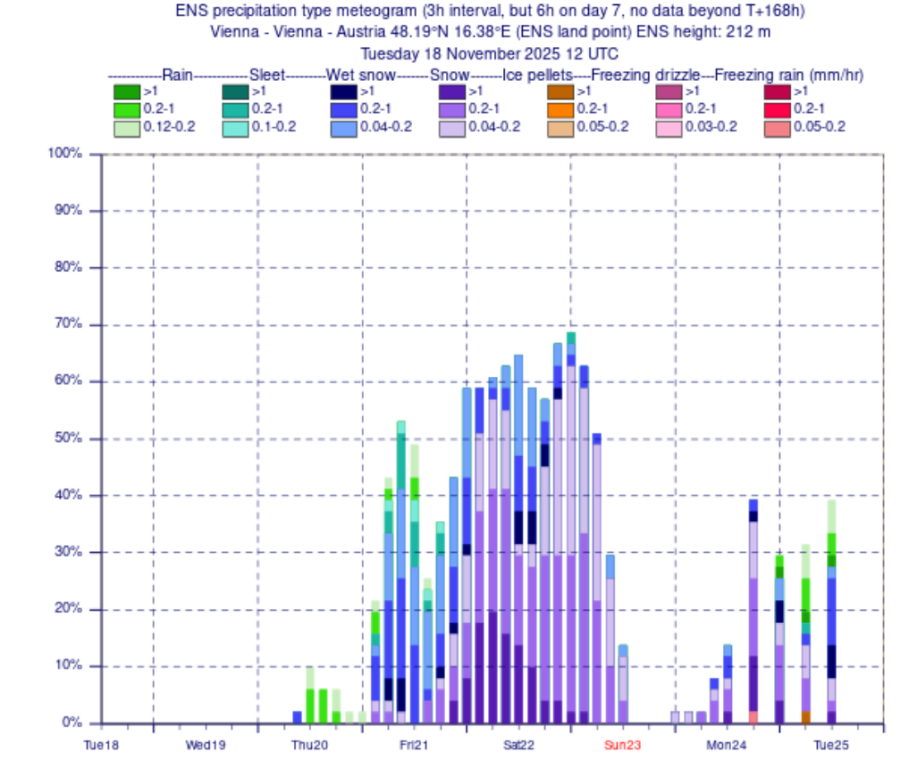 Am Dienstag rechnete das europäische EZMWF noch einen markanten Wintereinbruch von Fr-So im Osten/Südosten von Österreich. Davon ist heute im Hauptlauf nichts mehr übrig. Das amerikanische GFS rechnet seit Tagen am wenigsten und das deutsche Globalmodell ICON hat zumindest am Samstag ein Winterintermezzo im Wiener Becken im Programm. Auch nächste Woche rechnen alle Wettermodelle eine Fortsetzung der Troglage. Relativ sicher ist aber der Südstau und (viel) Neuschnee für die Südalpen, sowie die Beständigkeit der bodennahen Kaltluft im Alpenraum – das heißt, eine winterliche zweite Novemberhälfte zeichnet sich ab. Daran würde auch eine neuerliche Südwestströmung im Anschluss wenig ändern (Inversionslage). Zeit, die Ski zu wachsen und die Schneeschuhe aus dem Keller zu holen.
