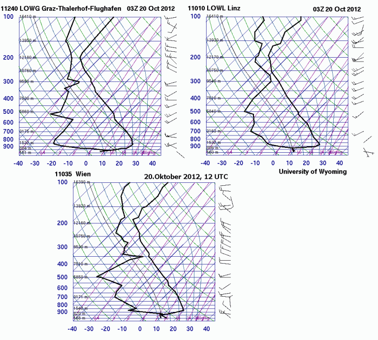 Die Radiosondenaufstiege zeigen alle eine markante Inversion bis auf 1500 m herab. Über der Inversion ist die Luft extrem trocken und warm. Bodennah wehen Ostwinde, darüber hat sich schwacher, in Wien bereits mäßiger Westwind durchgesetzt. Für das obige Bild ist keiner der Aufstiege repräsentativ, hier liegt die Obergrenze der Dunstschicht in rund 1900m Seehöhe. Das Westwindregime in der Höhe ist mit dem ostwärts ziehenden Rauch entlang der Nordhänge des Hochschwabs aber gut erkennbar.