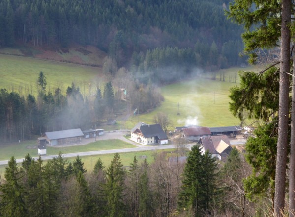 Senkrecht aufsteigender Rauch innerhalb der Kaltluftschicht, am Oberrand das Westwindregime erreichend, das sich im Tagesverlauf vielerorts mit milden Luftmassen durchsetzte.