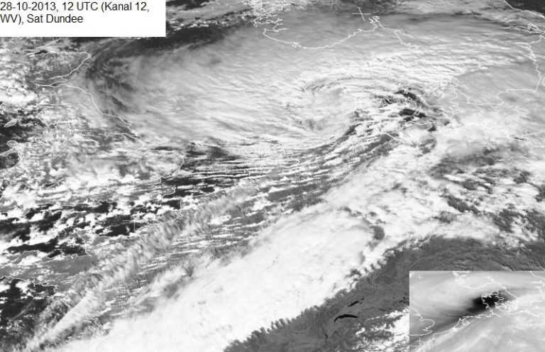 Es bleibt vorerst (eigene) Spekulation, ob die frontogenetische Querzirkulation alleine ausreichte, um den intensiven Höhenwind (100-120kt in 3km Höhe) bis in die Tallagen herabzumischen (zusätzlich verstärkt durch Downslope-Effekte), oder ob Verdunstungsprozesse wie bei einem Sting Jet beteiligt waren. Das betrifft auch das kleinräumige Randtief, das in Gestalt eines „dark WV streamers“ von der Zentralschweiz ausgehend nachts über Westösterreich weiterzog und in den Morgenstunden über dem nördlichen Salzburger Land zu teils erheblichen Sturmschäden führte.