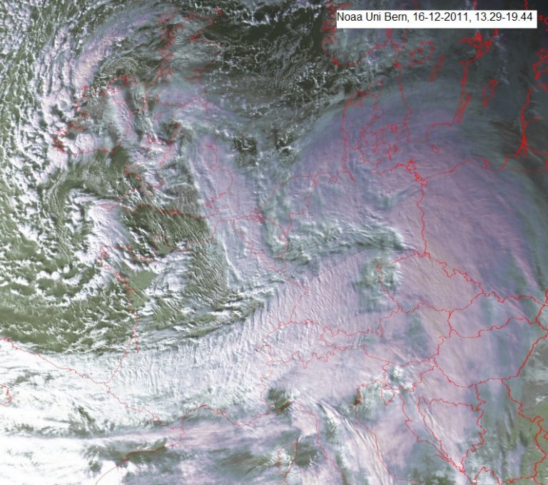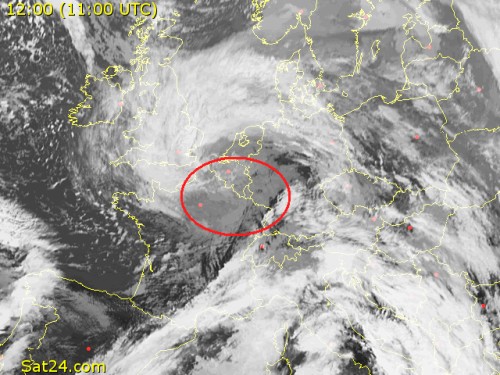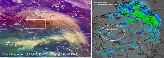 Das Luftmassen-Satellitenbild von 13 Uhr Lokalzeit sowie das Radarbild zeigen eine gut ausgeprägte Okklusion, die über Nordostdeutschland für intensiven Schneefall sorgte und die Spitzenböen deutlich dämpfte. Die Warmfront setzt sich über Polen fort. Die Kaltfront an der Vorderkante des Dryslots ist quasi inexistent, mit geringen Temperaturunterschieden und ohne linienhafte Strukturen im Radarbild. Orkanböen wurden zu diesem Zeitpunkt verbreitet über NRW gemessen, wo die Wolkenobergrenzen signifikant niedriger waren als im restlichen Bereich der Zyklone. Sie bilden die Fortsetzung der Okklusion, die im Bereich des Dryslots massiv verdunstet und sich dabei erwärmt. Nach neueren Theorien (z.B. Schultz 2013) ist die Verdunstungskälte nur eine Begleiterscheinung, nicht aber hauptverantwortlich für die Spitzenböen. Entscheidend ist die Frontolyse im Bereich der eingedrehten Warmfront/Okklusion, wo warme Luft absinkt und den starken Höhenwind als Sting Jet herabmischt.