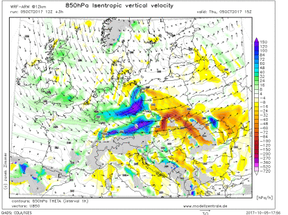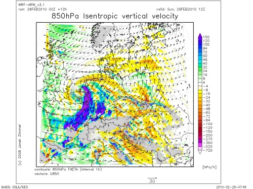 Wie schon bei den vorher gezeigten Beispielen zeigte auch Xavier in der isentropen Vertikalgeschwindigkeit starke Abwärtstendenzen.