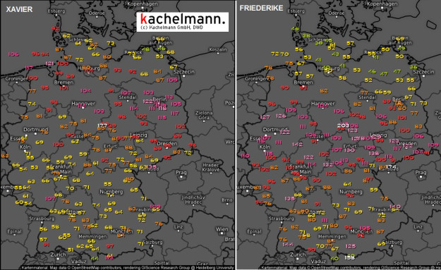 Beiden Sturmtiefs ist gemein, dass die Orkanböen nur ein einem verhältnismäßig schmalen Bereich auftraten. Wenn das Norddeutschland betrifft, kräht kein Hahn danach, dort ist man das gewöhnt. XAVIER traf aber zwei Metropolen, Hamburg und Berlin, noch dazu im Zustand belaubter Bäume und zur Rush Hour, FRIEDERIKE betraf das dichtbesiedelste Bundesland Deutschlands (NRW) sowie dichtbewaldete Mittelgebirge, wo entsprechend maximale Schäden für die Verkehrsinfrastruktur und Energieversorgung auftreten können.