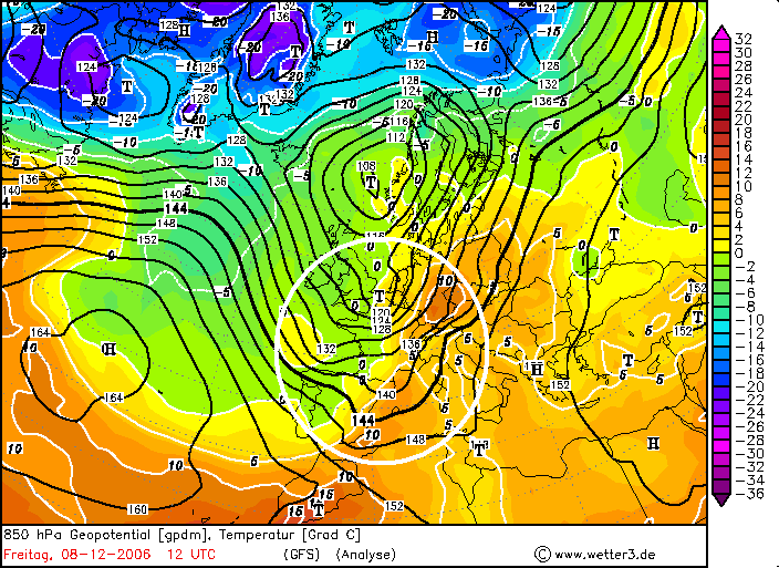 Die Temperaturverteilung in 850hPa unterstützt diese Annahme mit leicht negativen Temperaturen in der Poebene und bis zu +5°C im Südwesten Deutschlands. Die dynamische Anströmung ist hier also klar auch hydrostatisch verstärkt. Die Kaltfront reicht hier von den Orkney-Inseln über Benelux, Frankreich bis nach Nordspanien und näherte sich erst in den Abendstunden dem zentralen Alpenraum an; der Föhndurchbruch in Innsbruck geschah in den Nachmittagsstunden, hielt aber nicht sehr lange an, um abends erneut für ganze vier Stunden zu wehen.