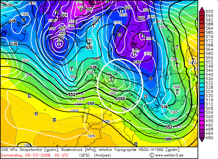 Die großräumige Wetterlage besteht aus einem ausgedehnten Trog von Skandinavien über Osteuropa bis in den östlichen Mittelmeerraum. Über dem Nordatlantik und weiten Teilen West- und Mitteleuropas sind in der nordwestlichen Höhenströmung Kurzwellentröge eingelagert, welche immer wieder mildere Atlantikluft hereinadvehieren. Zum besagten Zeitpunkt um Mitternacht befindet sich ein Bodentief mit 995hPa Kerndruck über Benelux, was nördlich der Alpen zu deutlichem Druckfall führt. Die steigende Schichtdicke nördlich der Alpen weist auf Warmluftadvektion hin – in der Poebene ist die Schichtdicke niedriger, weshalb hier noch Kaltluft ausgehend vom Tage zuvor erfolgten Kaltluftvorstoß rückseitig des Osteuropatroges lagert. Die nordwestliche Höhenströmung über die Alpen lässt zunächst keinen Südföhn vermuten.