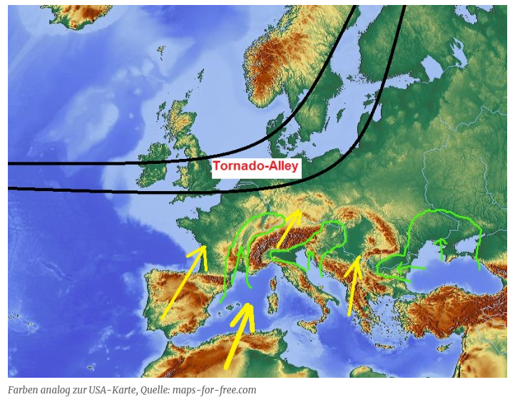 In Summe aber zeigt die Häufigkeitsverteilung zwei unterschiedliche Mechanismen, die zu erhöhtem Tornadopotential führen: In der Tornado-Alley vor allem in Zusammenhang mit der Frontalzone (viel Höhenwind, wenig Labilität), in den lokalen Hotspots in Südeuropa durch ein Zusammenspiel energiereicher Luftmassen und Interaktion mit der Topographie.