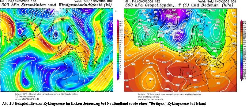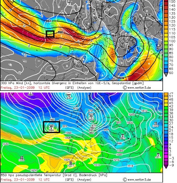 Der Tiefdruckkern liegt genau im Übergangsbereich des linken Jetauszugs zwischen sehr hohen Windgeschwindigkeiten (über 120kt) und geringeren Windgeschwindigkeiten (unter 80kt). Er befindet sich gleichzeitig auch im rechten Jeteinzug des Jets vor den Britischen Inseln. Das bedeutet kräftigen Hebungsantrieb von beiden Jets durch starke Höhendivergenz (angedeutet durch das große Plus-Zeichen). Das Tief verstärkte sich in der Folge zum Orkan über der Biskaya und richtete in Südfrankreich Schäden an.