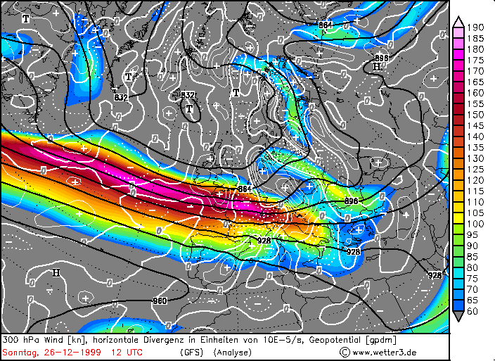 Abb.11 zeigt die Großwetterlage am 26.12.1999 um 0 UTC mit einem ausgedehnten Tiefdruckkomplex über dem Nordatlantik mit extrem niedrigen Geopotential und generell hohen Windgeschwindigkeiten in allen Höhenschichten. Die Frontalzone (schwarze durchgezogene Linie = 552 gpdm) verläuft vom Seegebiet südlich von Neufundland über Frankreich bis zum Balkan zonal und wird erst über dem Schwarzen Meer durch einen schwachen Langwellentrog ausgelenkt. Entsprechend herrschen auf dem zonalen Grundstrom über dem Atlantik zwischen dem tiefen Geopotential bei Island und dem Azorenhoch enorme Windgeschwindigkeiten in der Höhe.