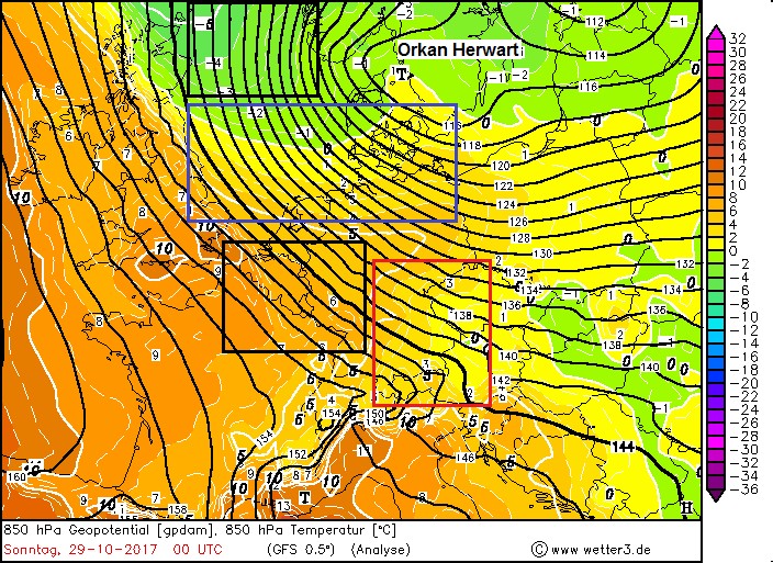 Abbildung 1 zeigt Geopotential und Temperatur auf der 850 hPa Druckfläche (1200-1500m hoch). Der Wind weht weitgehend parallel zu den Isohypsen. Je enger der Isolinienabstand, desto stärker der Wind und desto eher nähert er sich dem geostrophischen Gleichgewicht (weht also exakt parallel zu den Isohypsen).