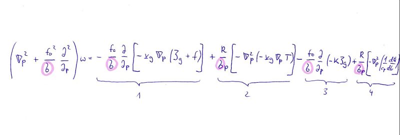 Der Nablaoperator ∇p bezieht sich auf Druckkoordinaten, fo ist der Coriolisparameter, welcher konstant gehalten wird (f-Ebene), σ ist die statische Stabilität, die mit α/θ ∂θ/∂p definiert ist, dabei ist α der Kehrwert der Dichte (der Term ähnelt im Aussehen der Brunt-Väisälä-Frequenz, welche ebenfalls ein Stabilitätsparameter ist).
