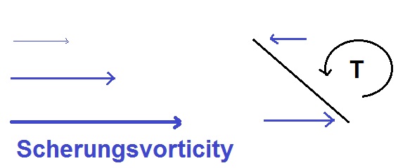 Eine gescherte Strömung setzt sich aus unterschiedlichen Strömungsrichtungen und -geschwindigkeiten zusammen. Im Falle eines geradlinigen Starkwindbandes in der Höhe (Jetstream) entfällt die Richtungsänderung. Wenn man den Jet jedoch von Norden nach Süden durchquert, dann nimmt die Geschwindigkeit bis auf ein Maximum (Jetachse) zu , um danach wieder abzunehmen. Diese Geschwindigkeitsscherung hat folgende Eigenschaft: