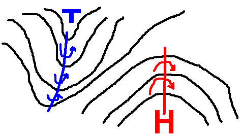 Abb.4 zeigt einen Trog, der entlang der Trogachse die stärkste Krümmung(svorticity) aufweist. Die stärkste Krümmungsvorticityadvektion würde sich demnach stromabwärts, also an der Trogvorderseite (= Hebung) befinden, wo man im Reifestadium auch das Bodentief erwartet. Im Keil ist es umgekehrt – die stärkste antizyklonale Krümmung verläuft entlang der Keilachse und die stärkste antizyklonale Vorticityadvektion befindet sich an der Keilvorderseite(= Absinken).