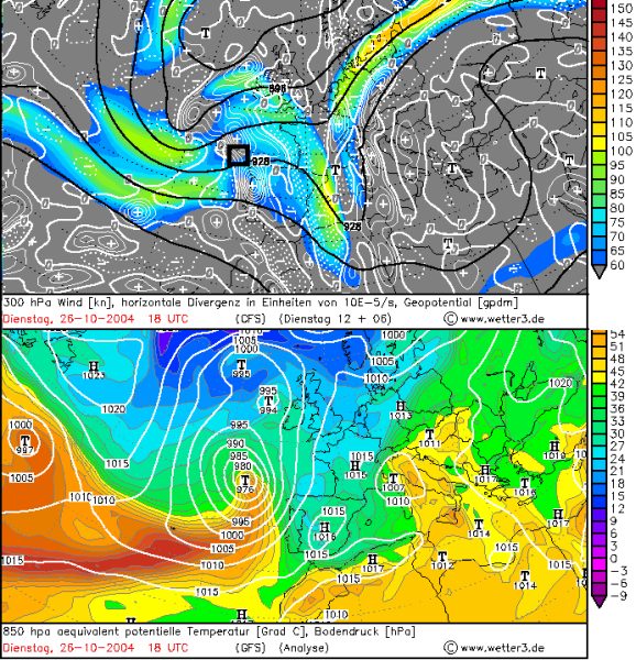 Abb.5 illustriert die Bedeutung der Krümmungsvorticity anhand eines Fallbeispiels vom 26. Oktober 2004. Die synoptisch-skalige Strömung verläuft über dem Atlantik meridional, mit einem weit nach Süden vorstoßenden Höhentrog. Die Höhenwinde sind nicht besonders groß, dafür besitzt der Trog erhöhte Werte zyklonaler Krümmungsvorticity. An der Trogvorderseite liegt ein kräftiges Bodentief (das spätere Orkantief „Carolin“, siehe unten).