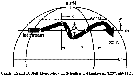 Abb.7 zeigt eine Wellenbewegung auf der Nordhemisphäre der mittleren Breiten (φ = 30-60°). Der Abstand zweier Wellenberge wird durch die Wellenlänge λ ausgedrückt, die Erstreckung in y‘-Richtung als Wellenamplitude 2A. Ab λ = 6000km spricht man von einer Langwelle (Rossbywelle).
