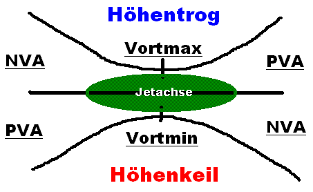 Auf der (kalten) Nordseite des Jets befindet sich an die Trogachse gekoppelt ein Vorticitymaximum (besser : ein Maximum positiver Vorticity), auf der (warmen) Südseite des Jets gekoppelt an die Keilachse ein Vorticityminimum (besser : ein Maximum negativer Vorticity). Schaut man nun stromabwärts nach links, so liegt im linken Jetauszug auf der Trogvorderseite ein Maximum positiver Vorticityadvektion (PVA), das durch positive Scherungs- und Krümmungsvorticity verursacht wird. Entsprechend ist im rechten Jetauszug, der Keilvorderseite ebenfalls ein Maximum negativer Vorticityadvektion (NVA) ersichtlich. Analoges gilt für die Eingangsbereiche des Jets.