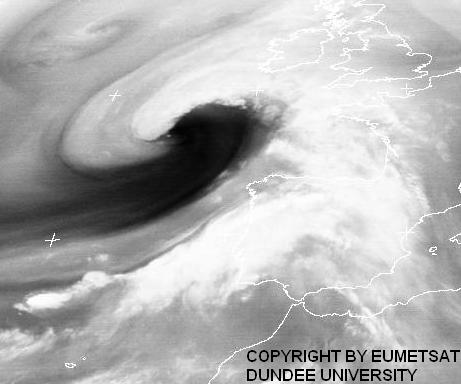 Dieser Umstand trifft vor allem bei explosiven Tiefdruckentwicklungen (rapid cyclogenesis) zu, wobei der Kerndruck innerhalb 24 Std. mindestens um 24 hPa zurückgeht. Im Reifestadium erstrecken sich trockene, im Wasserdampfbild schwarze Streifen/Zungen bis zum Tiefdruckkern und überrennen diesen zum Höhepunkt der Tiefentwicklung. Im Englischen wird dabei zwischen dem Prozess der Dry Intrusion und dem sichtbaren Produkt Dryslot unterschieden.