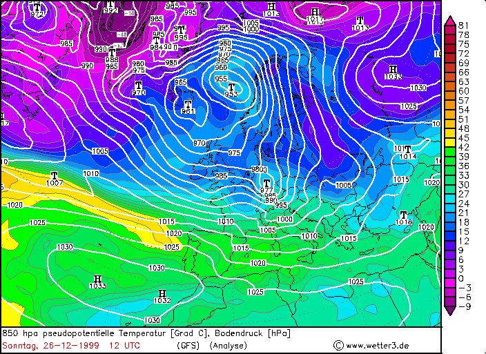 Im Bereich des Jetstreams haben sich drei Tiefdruckgebiete in verschiedenen Entwicklungsstadien entwickelt. Westlich von Brest befindet sich „Lothar“ mit einem Kerndruck von 985hPa und einem noch nicht okkludiertem Frontensystem. Dahinter folgt als kaum erkennbare Störung „Lothar Successor“ nach , von der ZAMG später als eigenständiges Tief analysiert und über Deutschland als „Hessen-Sturm“ bekannt, welches nochmals Orkanböen hervorbrachte. Südlich von Neufundland liegt die Welle „Martin“ direkt auf der Jetachse, während Lothar und Lothar Successor auf der kalten Seite des Jets im Bereich hoher positiver Scherungsvorticity und horizontaler Temperaturgegensätze liegen.