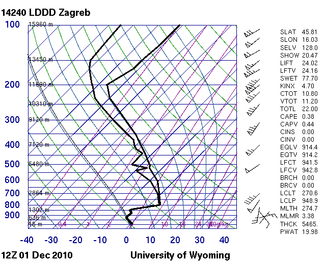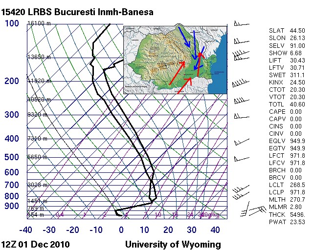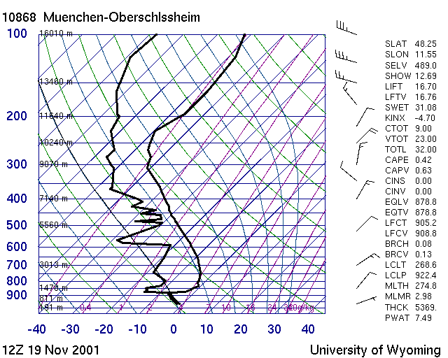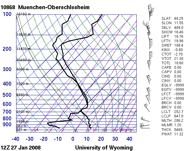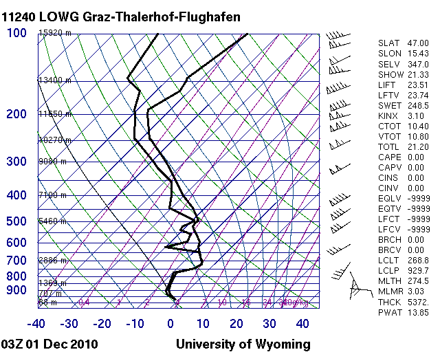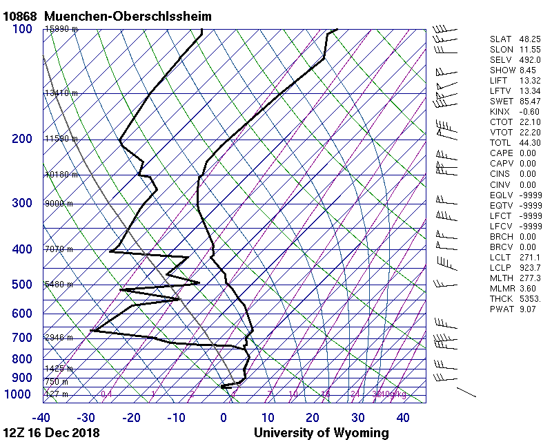 Der Sondenaufstieg zeigt oberhalb 900 hPa eine ausgesprochen mächtige Warmluftschicht mit 35 Knoten Südwestwind, darunter aber eine ebenso mächtige Kaltluftschicht mit immerhin 25 Knoten Nordostwind (in Emden nur 5 Kn), d.h. spürbare Kaltluftadvektion. Die Kaltluft wurde dabei um den Karpatenbogen nach Süden, später Südwesten, gelenkt. Der Gehalt an niederschlagbaren Wasser (PWAT) war mit 23 mm wesentlich höher als im Emden-Fall (15 mm).