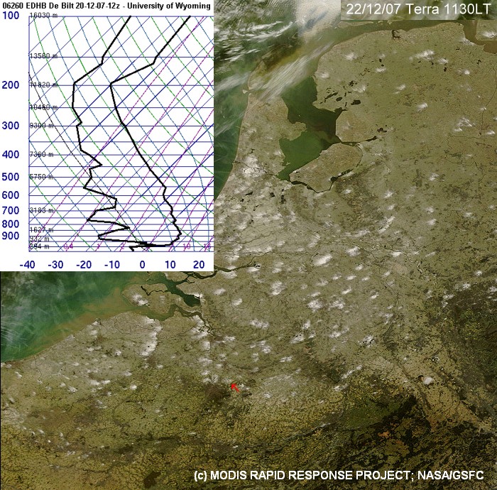Zwei Tage vor der gezeigten Aufnahme vom 22.12.2007 gab es flächendeckend eine Stratusdecke, die für den notwendigen Wasserdampf sorgte. Die hellen Flecken zeigen teils beträchtliche Mengen an Industrieschnee (10 cm und mehr, örtlich sogar über 20 cm) in der Nähe von Städten und Industrieanlagen.