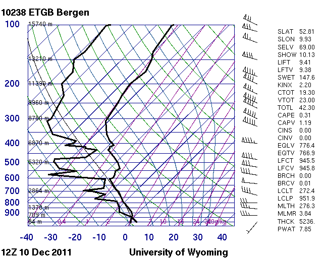 Ausnehmend schöne Warmluftadvektion und Rechtsdrehung des Windes mit der Höhe (von Ost auf Südwest), warme Nase in 900 hPa und rund 400 m dicke Frostluftschicht. Schuld an dieser Wetterlage hatte ein Skandinavienhoch mit einem Kaltluftkörper an seiner Ostflanke, der mit nordöstlicher Bodenströmung nach Norddeutschland transportiert wurde. Von Westen näherten sich atlantische Tiefdruckgebiete und die übergreifende Warmfront gleitete schließlich auf der zähen Kaltluftschicht am Boden auf.