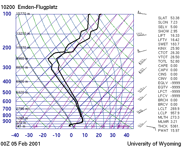 Der Radiosondenaufstieg von Emden begleitet mich seit der Vorlesung in Flugmeteorologie an der Uni Innsbruck. Er wurde als Lehrbuchfall für Glatteisregen angeführt. Die Bedingungen verwundern nicht: